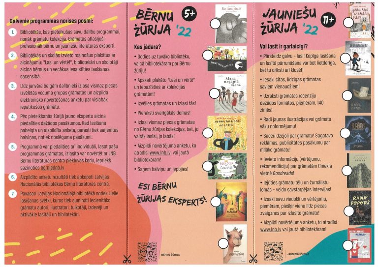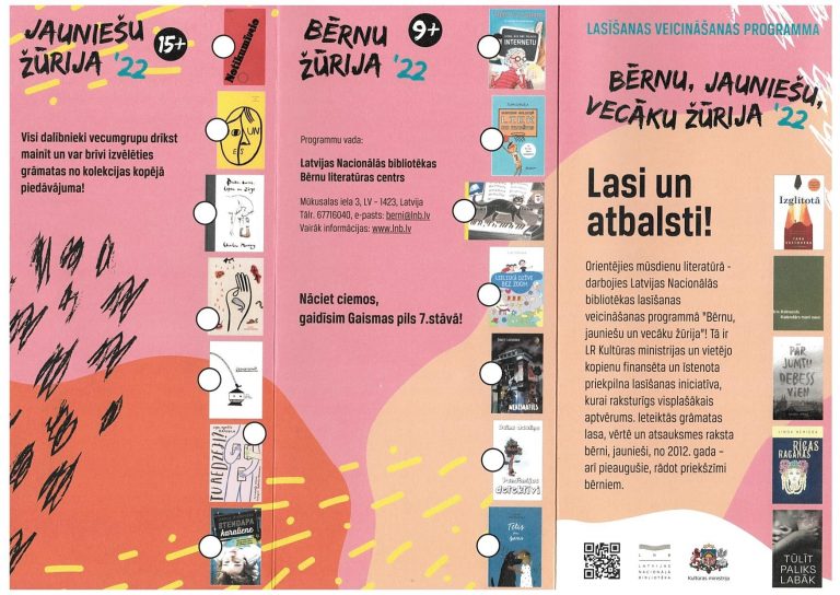 Latvijas Nacionālās bibliotēkas (LNB) izveidotā un vadītā lasīšanas veicināšanas programma “Bērnu, jauniešu un vecāku žūrija” notiek jau 22. gadu. Šogad katrā vecumgrupā ir septiņas grāmatas, bet Vecāku žūrijas kolekcijā – piecas.