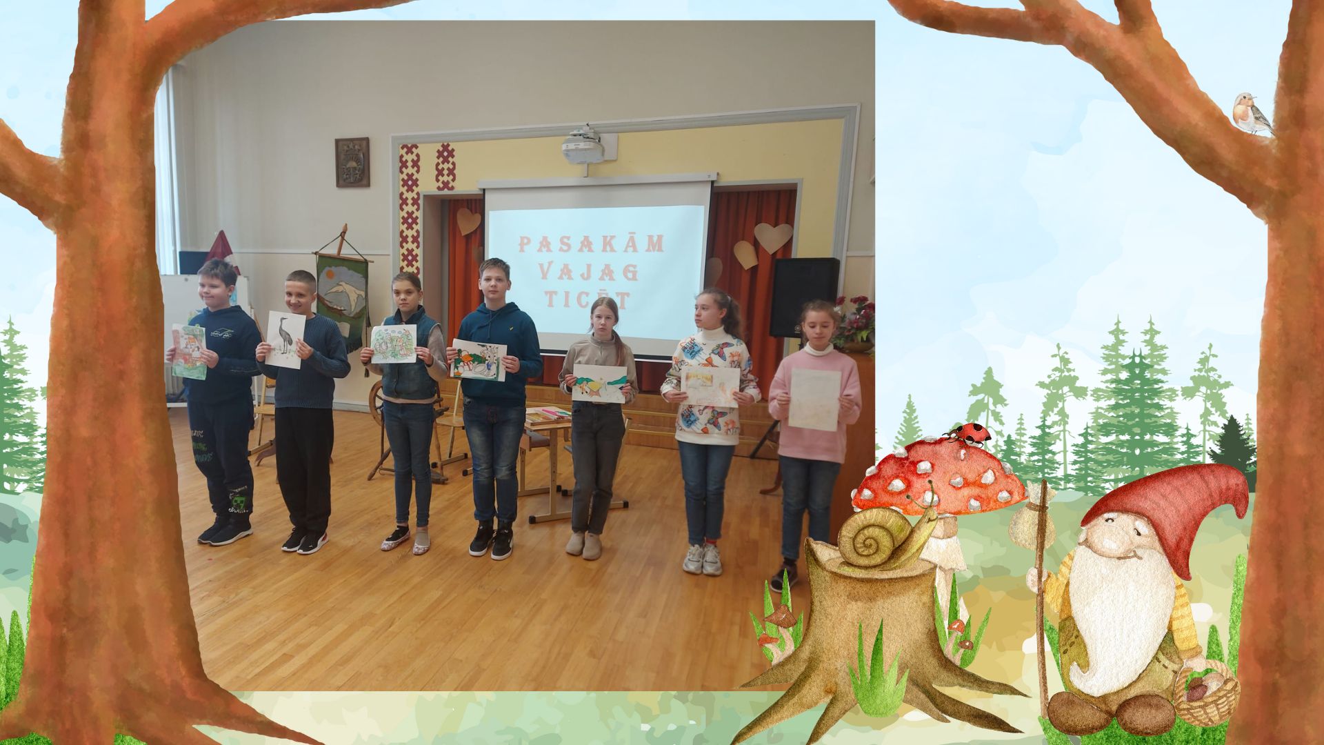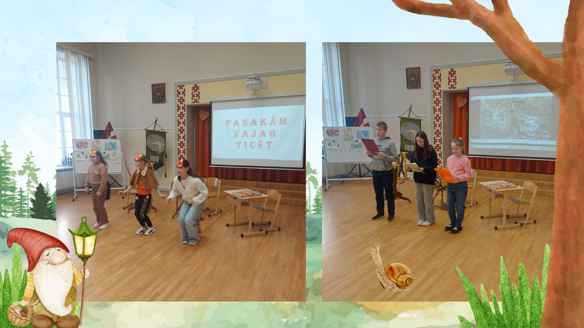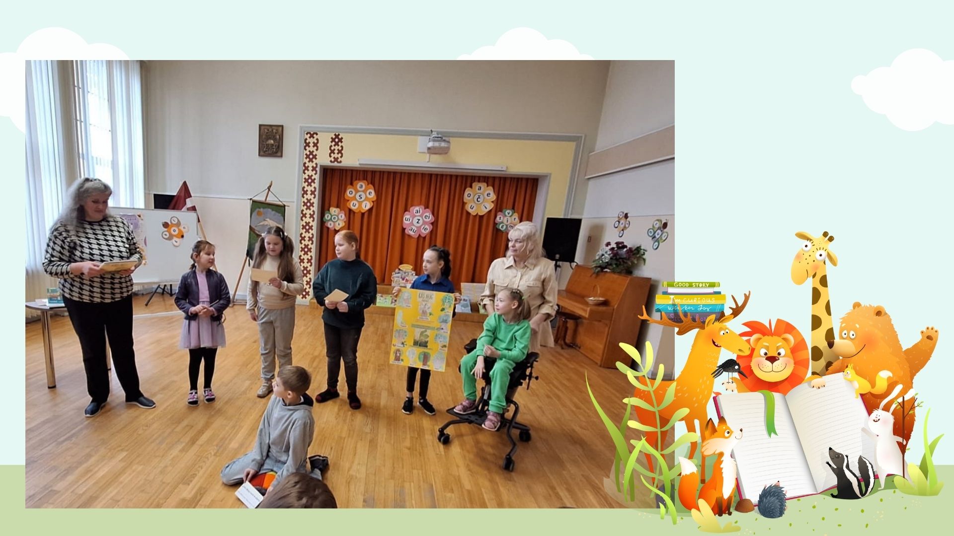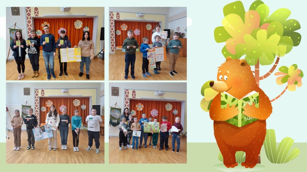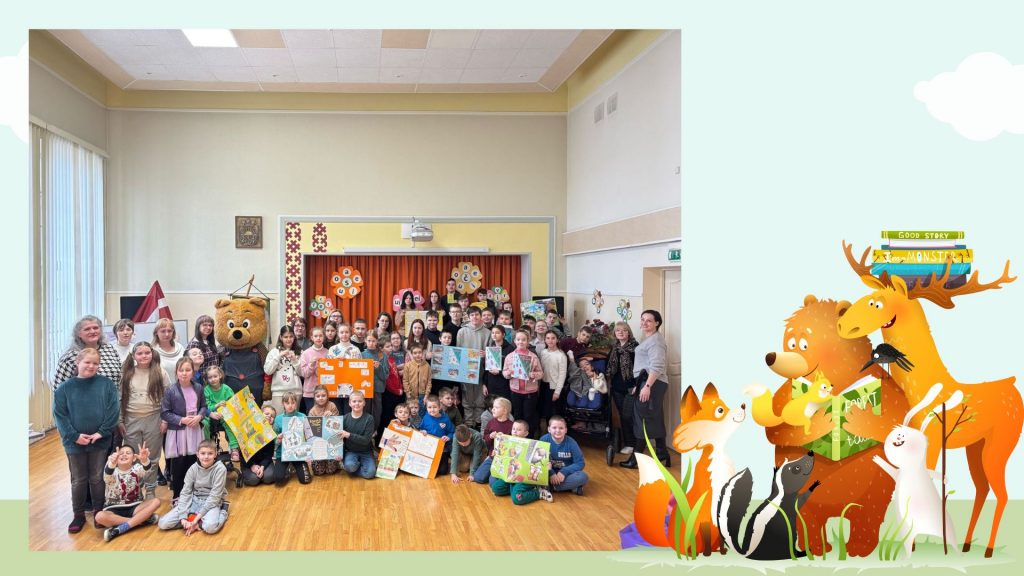 Tālāk notika lasīto “Bērnu, jauniešu un vecāku žūrijas 2024” grāmatu kolāžu prezentācija. Katrai klasei bija jāpastāsta par paveikto.